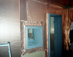 病院のX線検査室の内装工事です。微量の電磁波も漏らさないように、室内の6面を鉛板で覆い、その上にグラスウールを敷き詰めて、さらに銅箔でカバー。鉛ガラスで、窓からの漏えいも防ぎます。